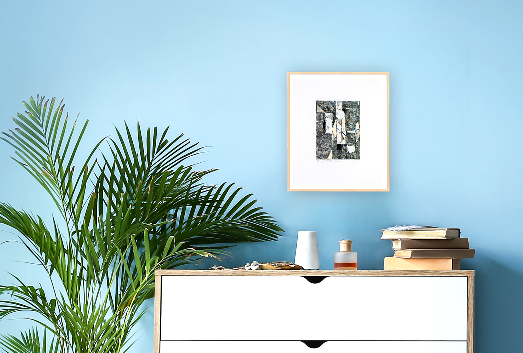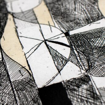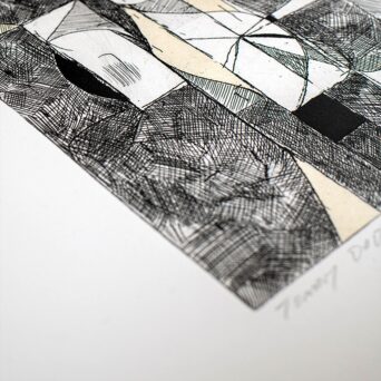 This one-color copper plate intaglio print uses line etching and aquatint to combine precise linear detail with subtle tonal variation. A six-piece chine collé of Thai mulberry paper is applied during printing, integrating delicate handmade textures into the image. Together, these processes create a layered work that emphasizes materiality, depth, and the tactile nature of printmaking.