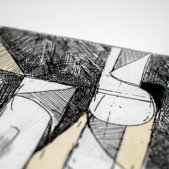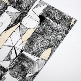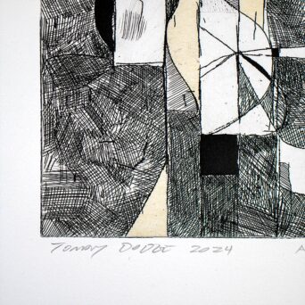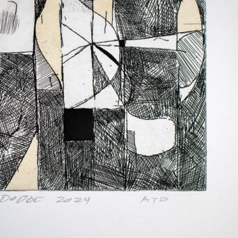 Across these three intaglio processes, Tomory Dodge explores the tension between control and improvisation. Line etching provides a structured foundation, while aquatint, spit-bite, and sugar-lift introduce instability, gesture, and tonal depth. Rather than treating printmaking as a purely reproductive medium, the work positions the copper plate as an active site of resistance and transformation, aligning intaglio with painterly concerns of process, density, and movement.